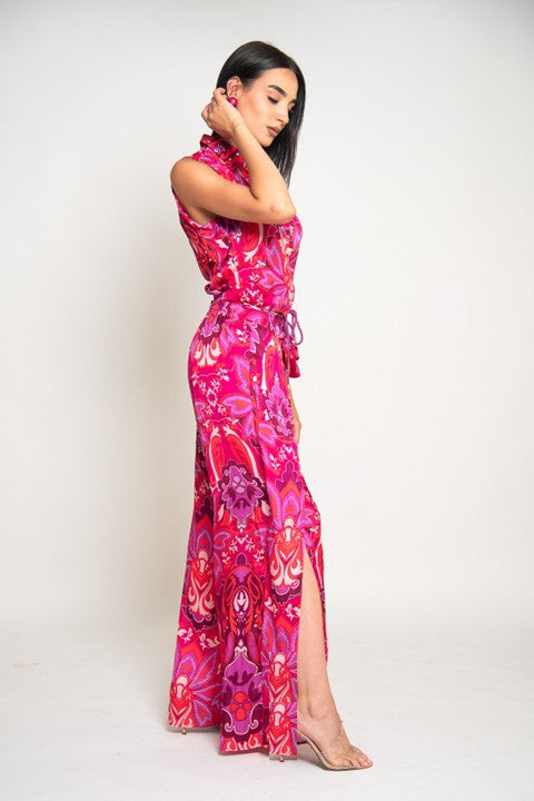 Pantalon taille haute avec taille élastique au dos. Ceinture avec nœud avec le même tissu. Jambes larges avec fentes sur les côtés.